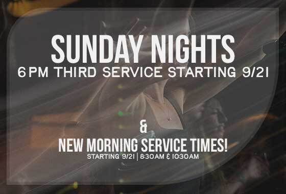 Join us for new Sunday Service times. 8:30am, 10:30am and 6:00pm